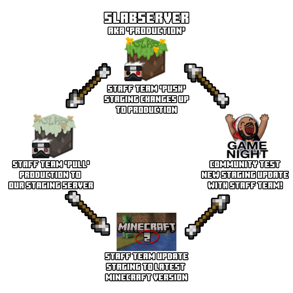 By using a Production <-> Staging server setup, we are able to 'pull' everything on Slabserver to our Staging server, update our plugins and datapacks, and then 'push' those changes up to Slabserver.