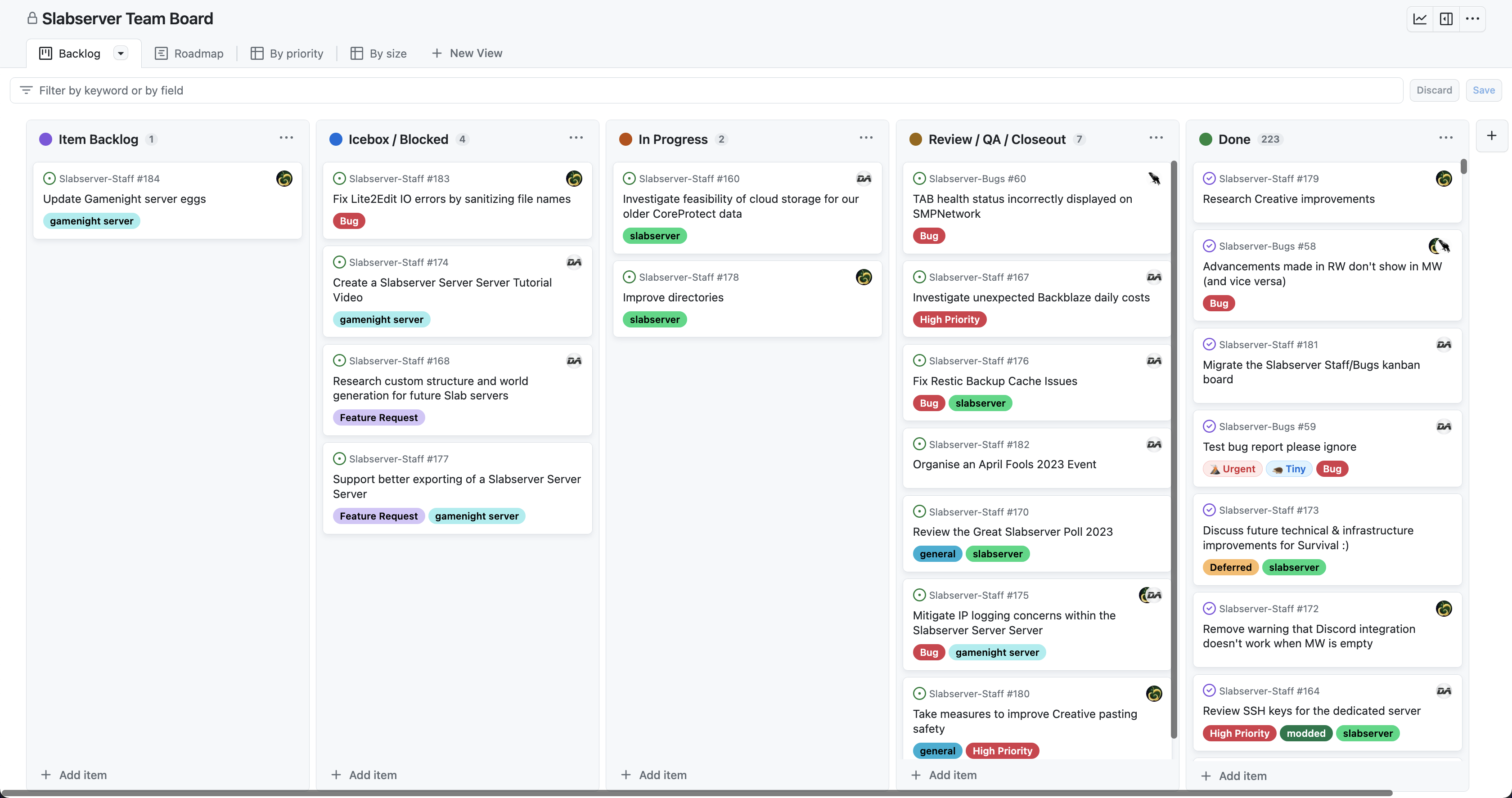 We migrated our kanban board to GitHub Projects, after ZenHub decided to try and charge a lot of money. Our State of the Slab screenshots will look a little different, but the new board is a little simpler, a little cleaner, and now integrated in the main Slabserver organization on GitHub. We’re so professional.